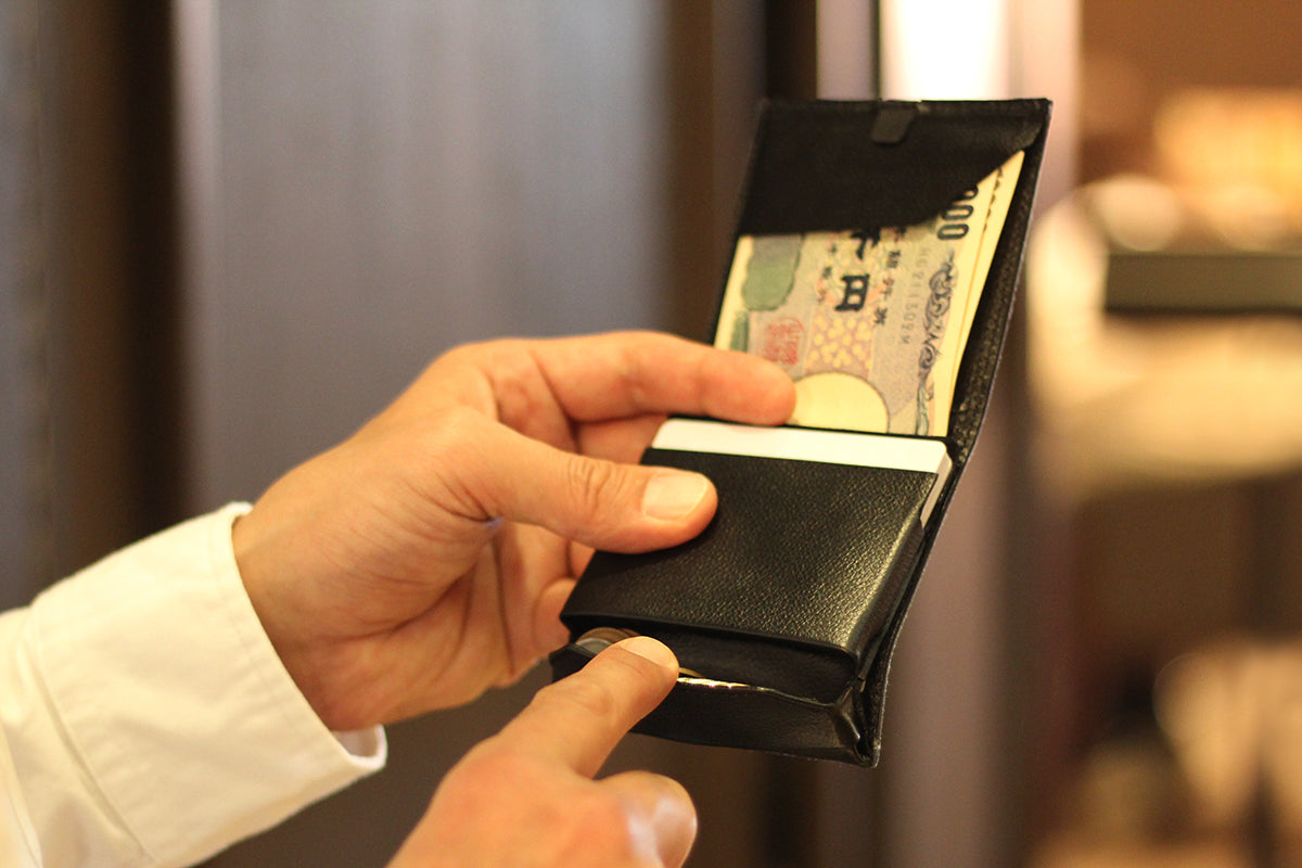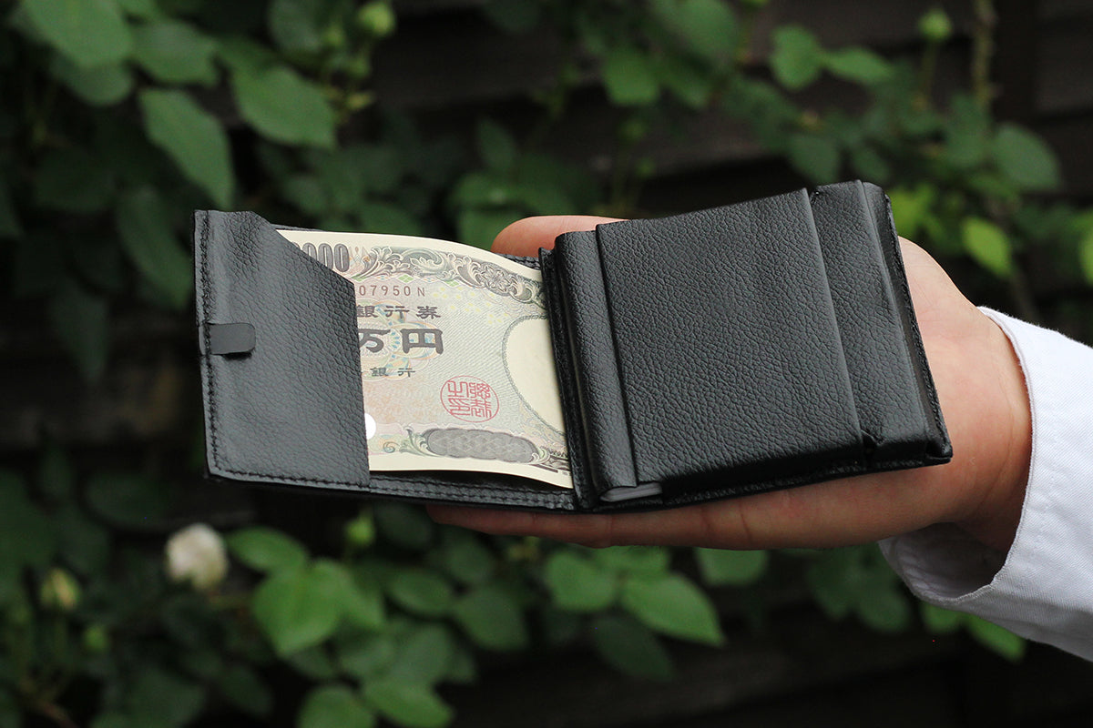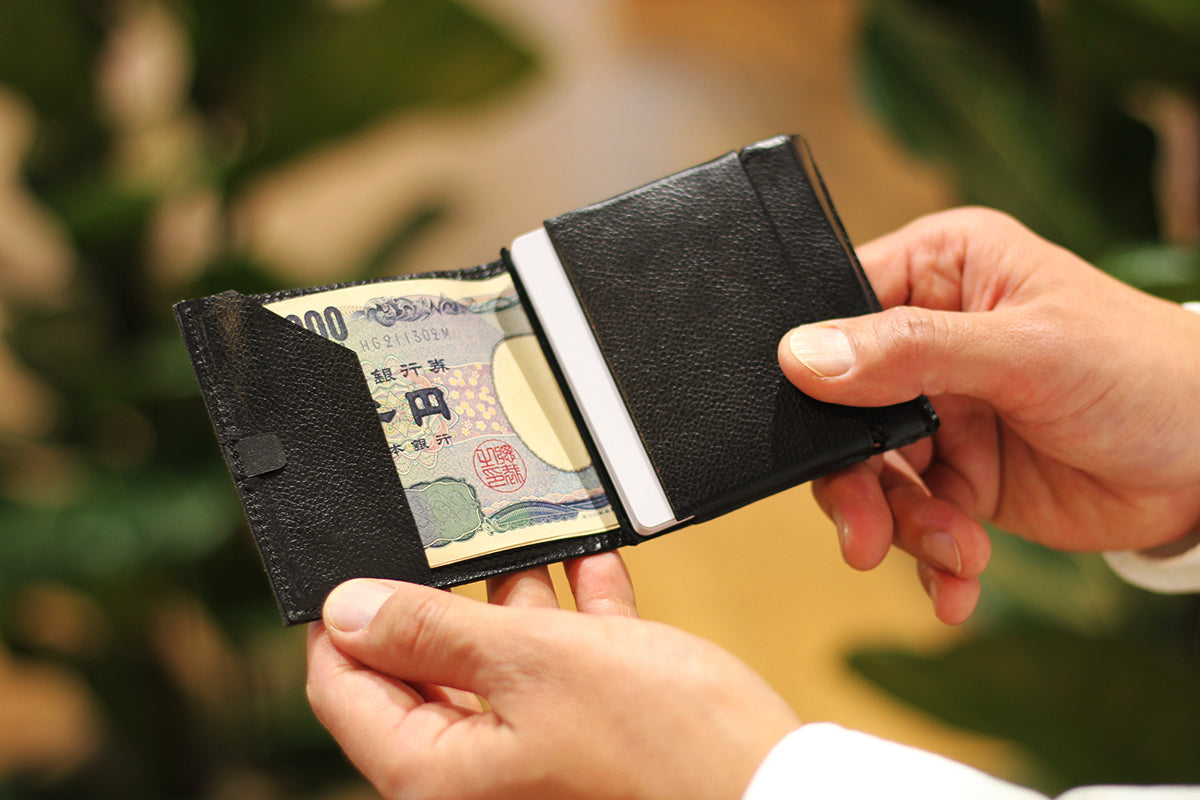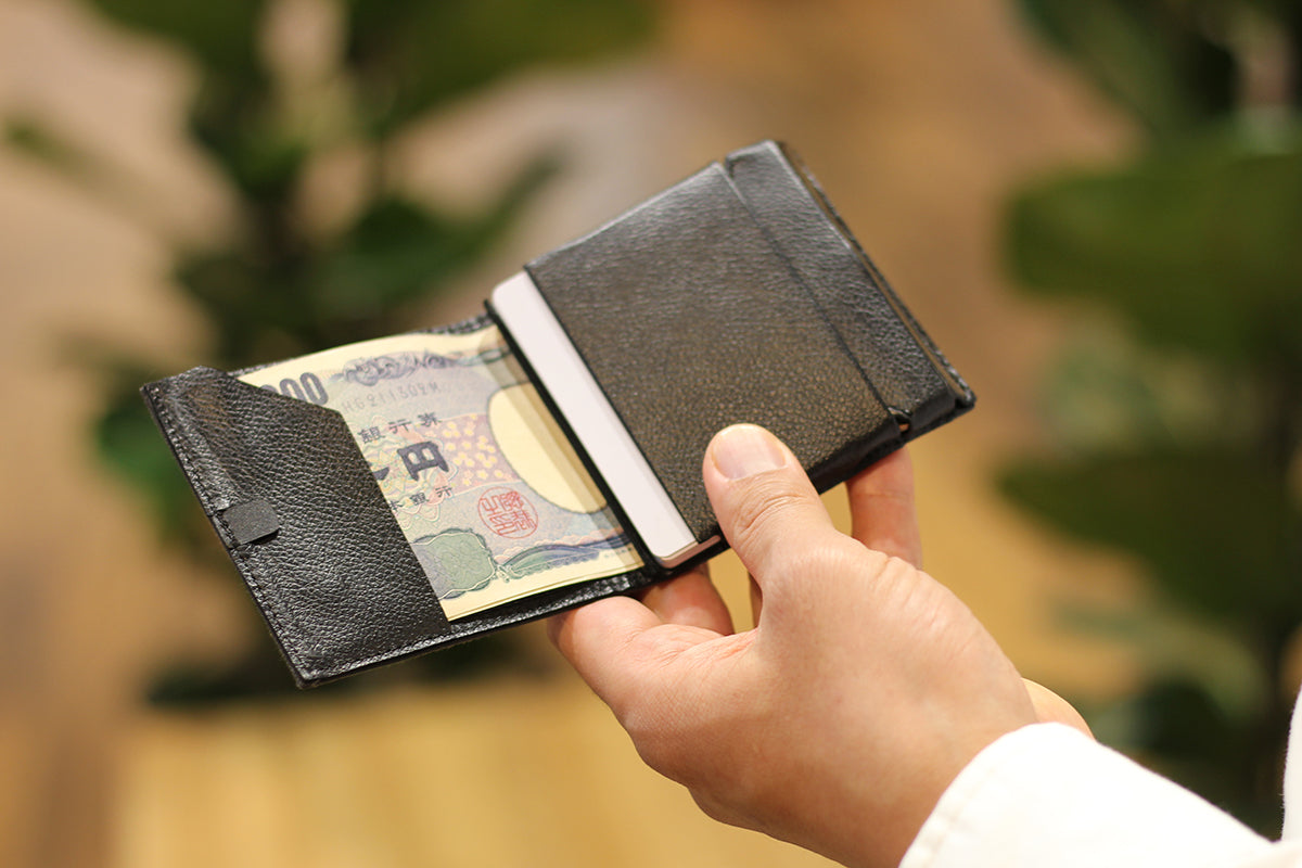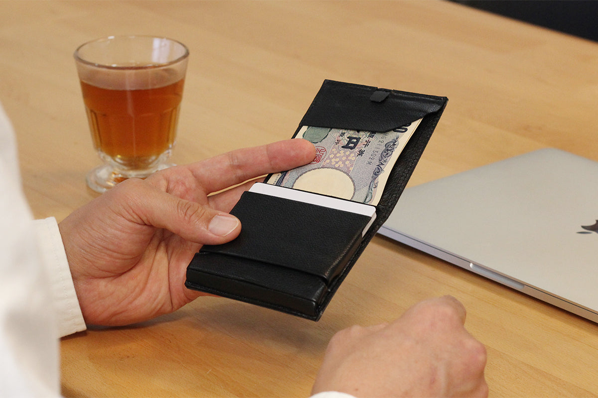 素材と設計を工夫することで、収納力を犠牲にせずに8ミリの薄さを実現しました。財布の内側には薄くて強靭なゴートレザー(ヤギ革)を使用しています。ゴートレザーの薄さはたった0.5ミリで、財布を薄くするための重要な素材になっています。