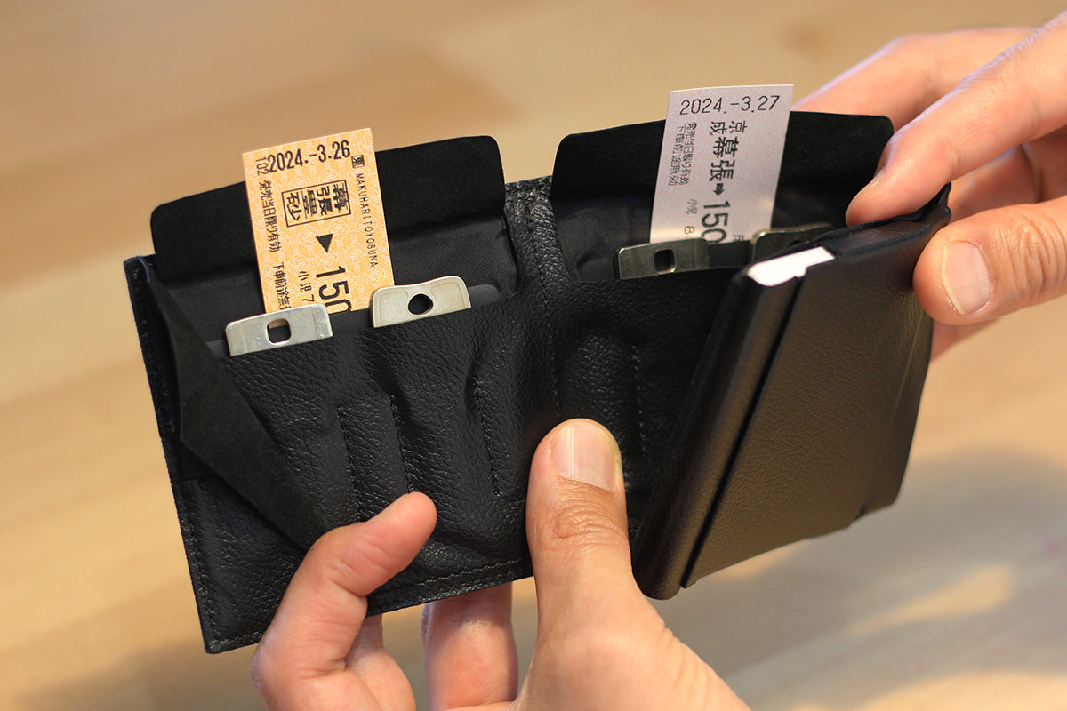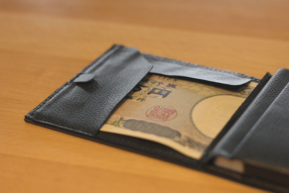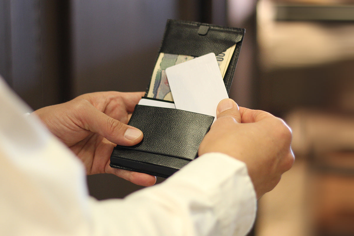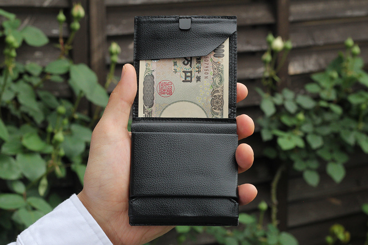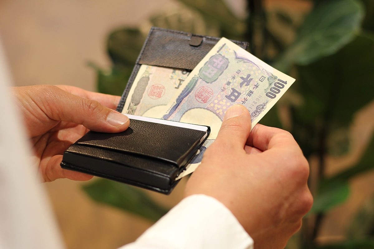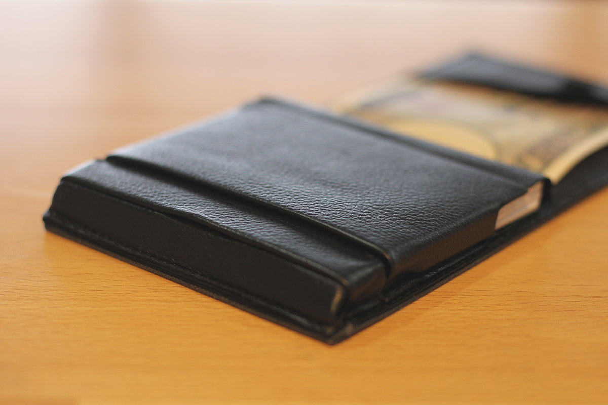 素材と設計を工夫することで、収納力を犠牲にせずに8ミリの薄さを実現しました。財布の内側には薄くて強靭なゴートレザー(ヤギ革)を使用しています。ゴートレザーの薄さはたった0.5ミリで、財布を薄くするための重要な素材になっています。