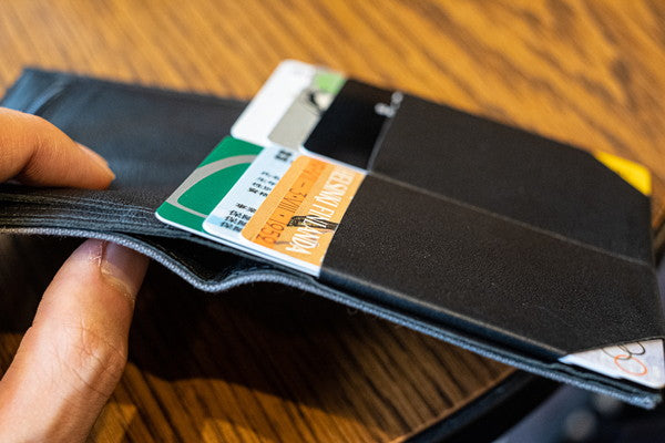 カードスロット:2カ所のスロットに各4枚づつ、計8枚のカードが収納可能。数枚入れるのは最初はきついかもしれませんが山羊革の伸縮特性により伸びて馴染んできます。4枚づつのカードスロットを2カ所に分散する事で薄さを実現しています。