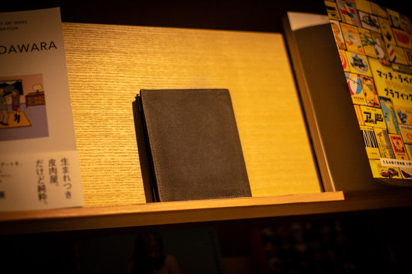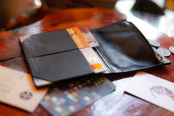 約6㎜の薄い財布で物を入れた時も薄さを保てるよう設計されています。財布表面にはきめ細かさと強靭性を兼ね備えた純綿帆布を使用。更に帆布には蝋引き処理が施してあり使えば使うほど艶や味わいが出てくる頼もしい素材です。財布内側には薄いながらも強靭な山羊革を使用しており財布全体の薄さに貢献、伸縮性のあるカードスロット等必要不可欠でこの財布にとってなくてはならない存在です。